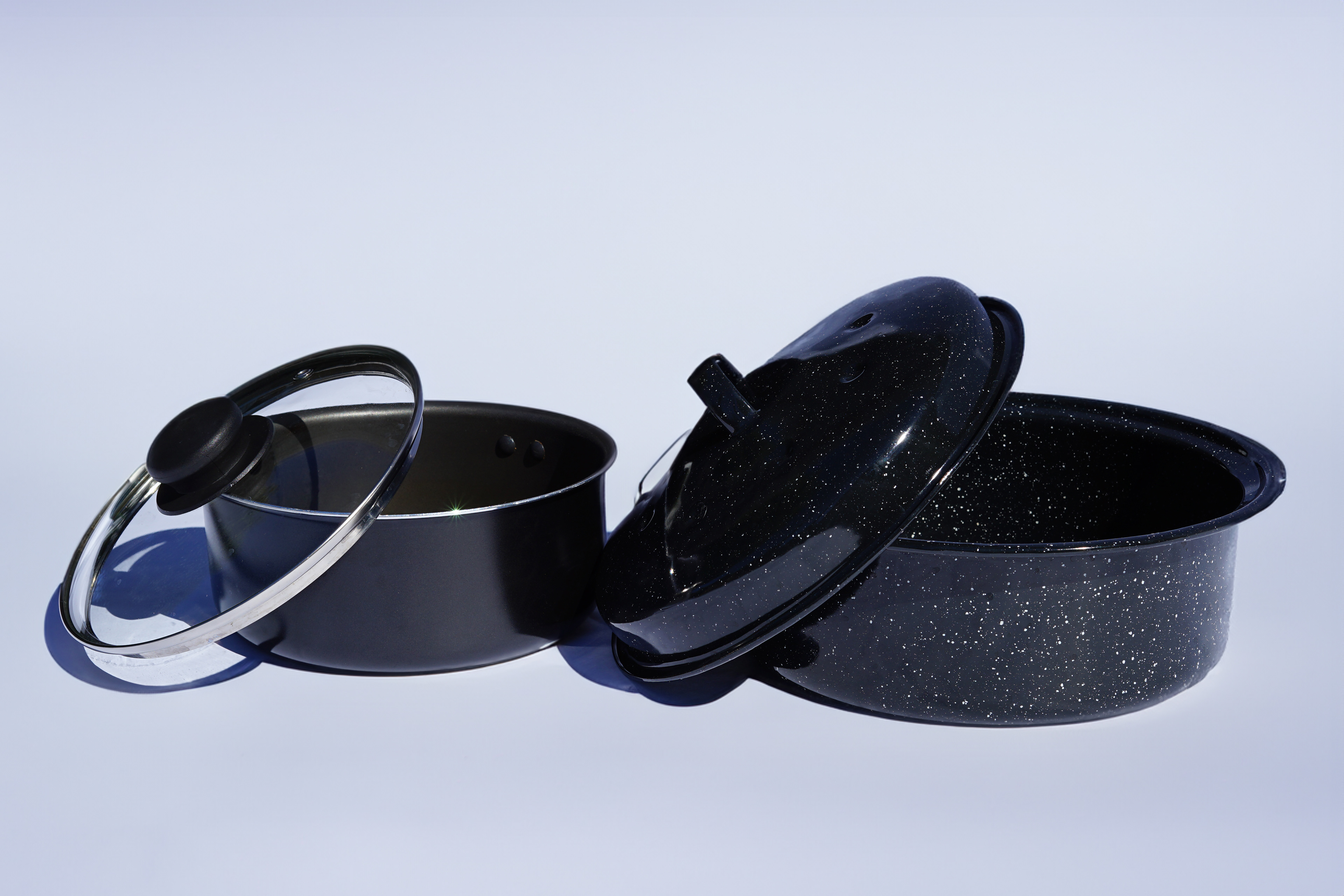 Cooking Containers should be made heat safe materials. A dark, thin metal container works well (graniteware, dark nonstick pots/pans). Cast iron takes a long time to heat, but keeps the heat a long time and can keep cooking if clouds pass by. Glass cookware allows the cook to see the food without having to open the container, but may not conduct heat as well as black metal.