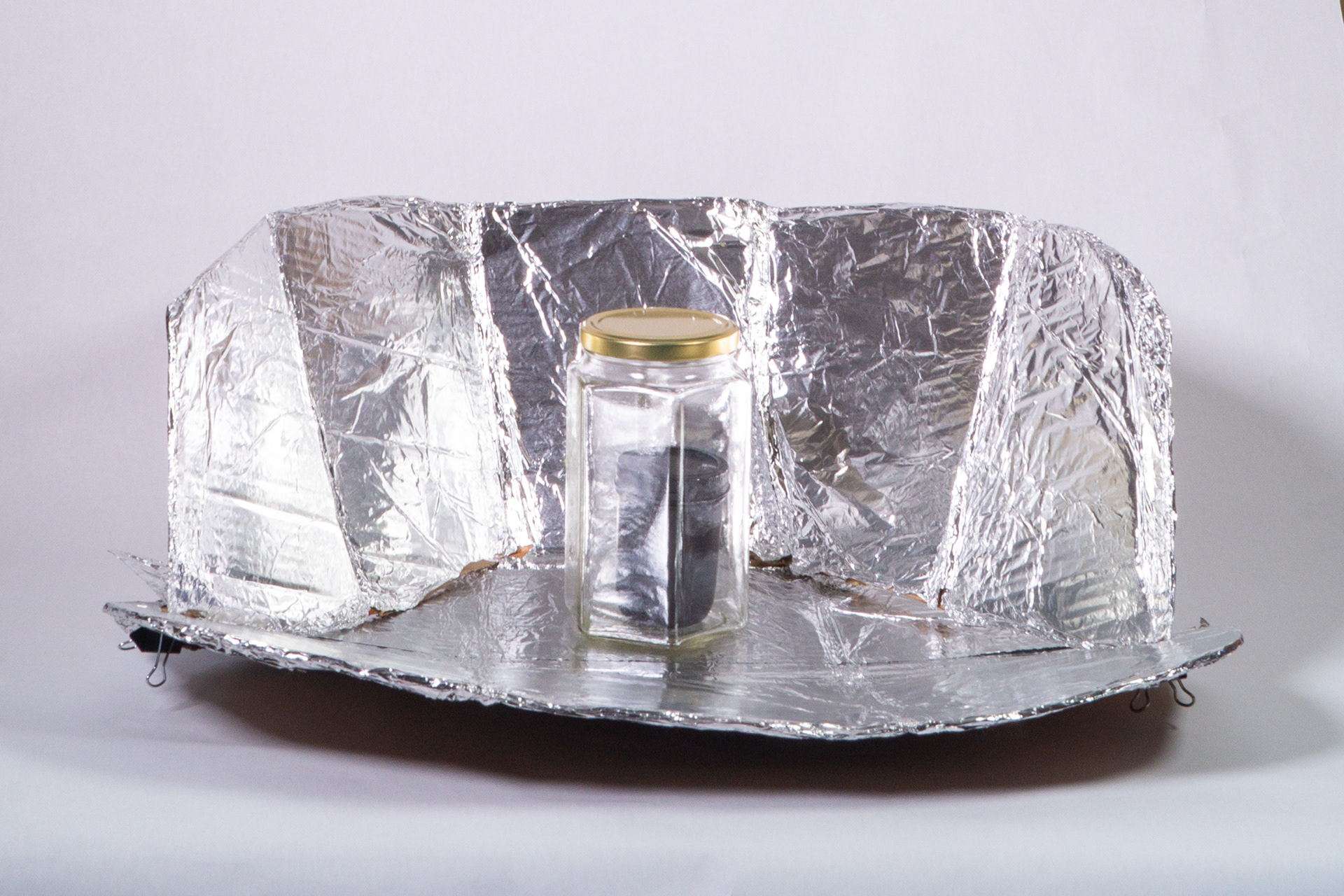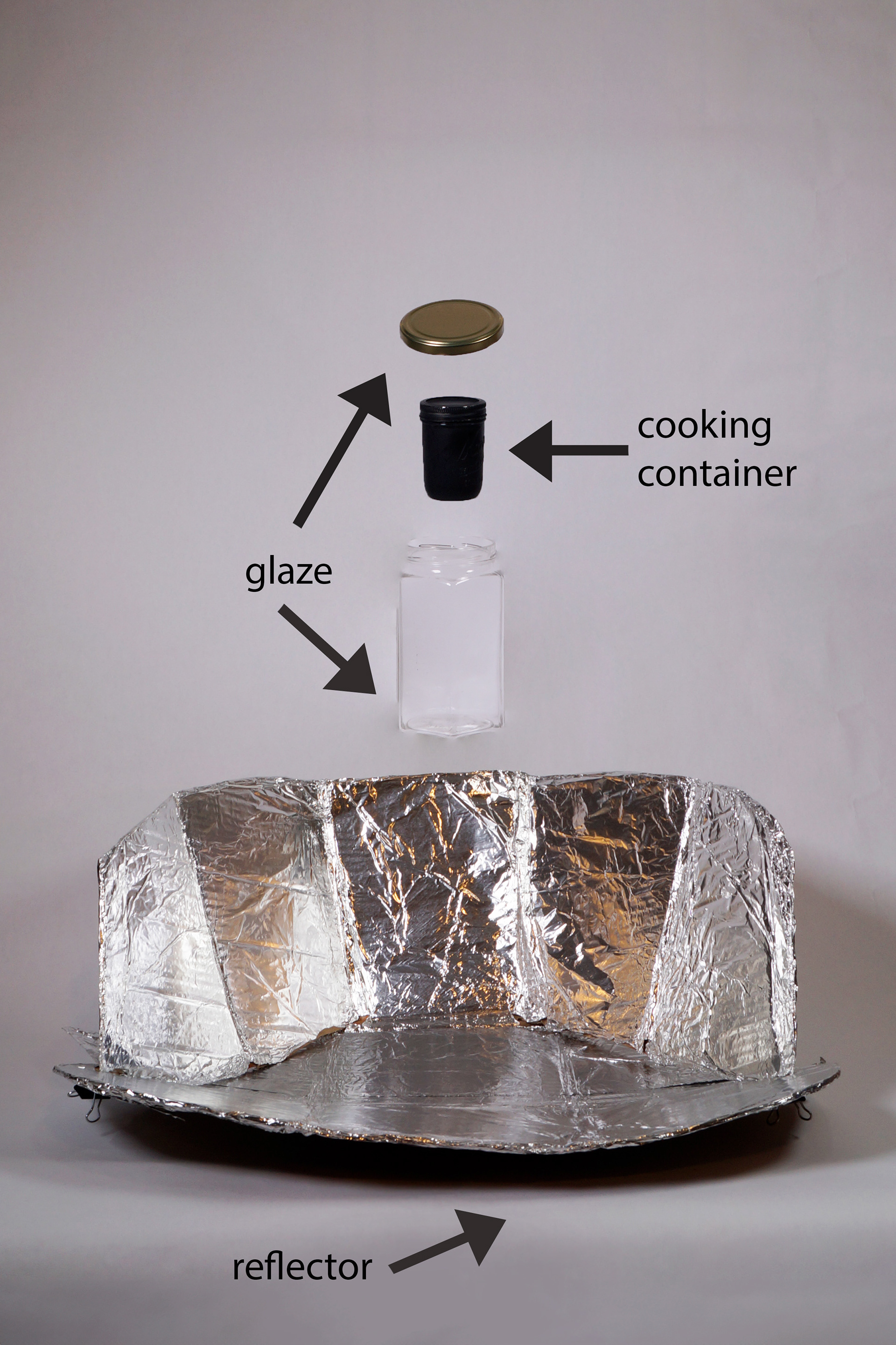 The bare minimum you need for a solar cooker is a reflector, glaze (glass or plastic to keep the heat in), and a cooking container. You may want to consider using a wire rack (or mason jar lid bands) to help the hot air go around the cooking container. For some types of cookers, insulation can be added to increase the temperature.
